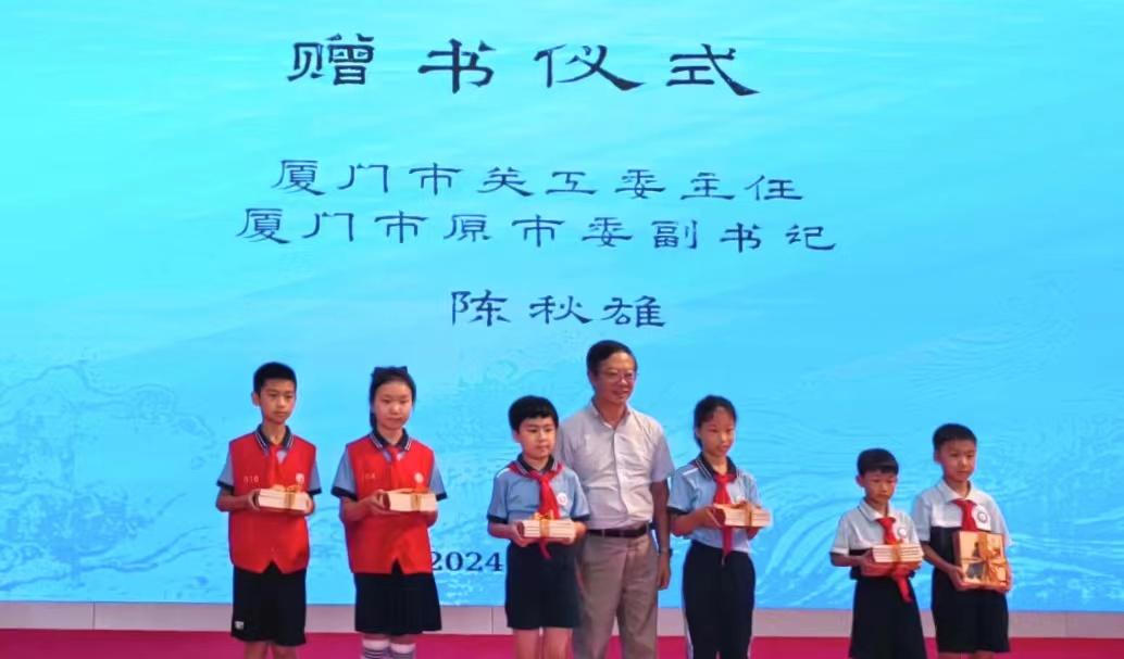 厦门市演武小学的代表上台接受主办方捐赠的郑成功文史书籍。(孟江波/供图)