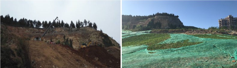 最终,完成排险5600余平,削坡4400余方,回填种植土近2.5万方,移植各类苗木830株,撒播草坪680kg,苗木成活率大于98%。本次复绿工程将破损面上可能产生滑动的岩石全部清理干净,消除了临空高陡坡面的地质灾害隐患,而且通过锚喷与绿化相结合的方式消除了视觉污染,建成山体公园,创造了城市的整体环境美。