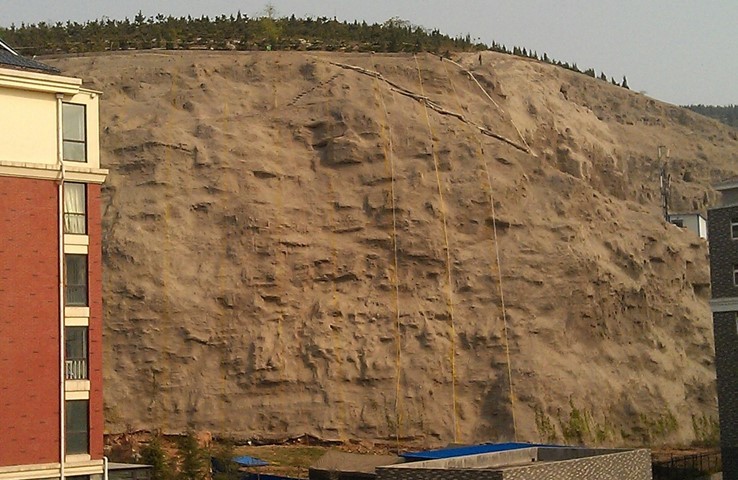 洪山西坡北段坡面基本由一个坡面组成,山体高度约45m,坡度70°~75°,局部80°~85°,下部有空地。工作区地貌类型主要为低山丘陵区,属于剥蚀堆积区,由于人工爆破开采等影响,岩石破碎,表层风化强烈,山坡主体缺少植被覆盖。由于破坏了原植被的生态环境、自然资源和城市景观,造成山体裸露、水土流失,而且多数山体裸露部分都分布在城镇周边及交通干线,严重影响生态景观,阻碍当地社会经济的可持续发展。