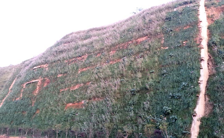 工程首先通过削坡排险、挂网喷砼、修建挡土墙、碴土及种植土回填、修建截水墙确保坡体的安全性、稳定性,然后进行植被绿化及养护。最下层陡立面挡土墙内间种黄栌、侧柏,陡坡下种植爬山虎;平台内测挡土墙内栽植高大乔木栾树;北侧山坡绿化考虑苗木有层次的分布,苗木种类依次为连翘、黄栌、侧柏、刺槐,设计种植连翘、黄栌、侧柏各7排,剩余面积全部种植刺槐。