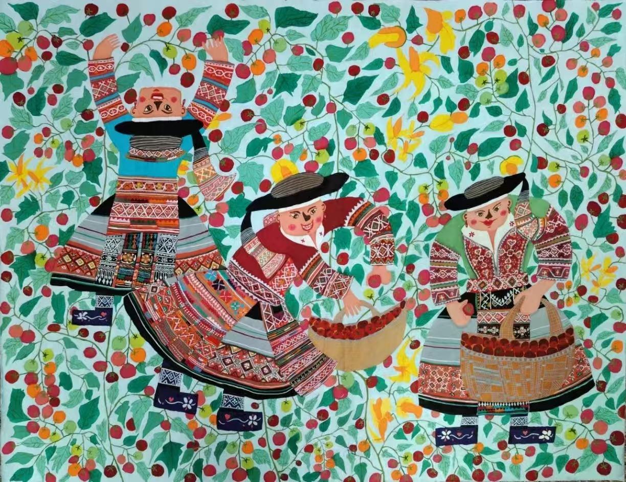 8月21日,从贵州省文联传来好消息,上述农民画展共收到应征作品1815件,涉及30个省、市、自治区,覆盖了全国主要农民画画乡。经过专家评审,共选出150件优秀作品参加展览,贵州入展的11件作品中,就有项秋艳的《番茄园》。
