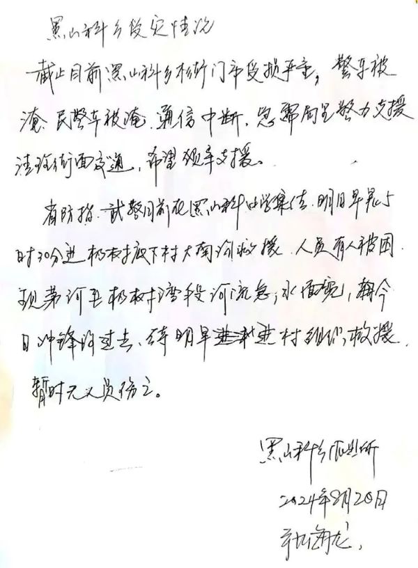 20日中午,有其他派出所的同事来我这里了解情况,通讯中断,我只能通过信件的方式,将情况报给指挥中心,请求支援。