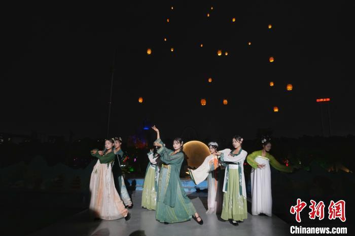 图为舞者在孔明灯下翩翩起舞。中新社记者 杨华峰 摄