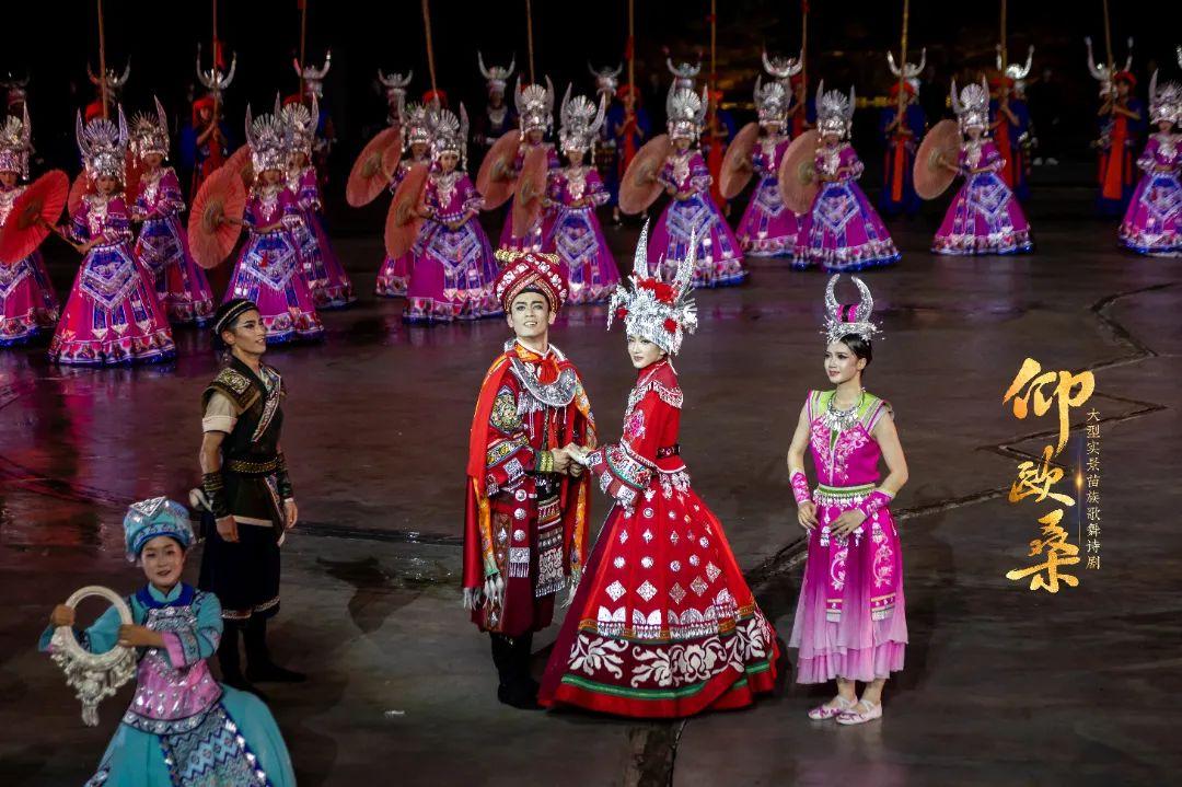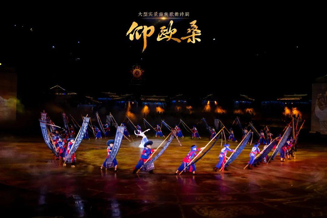 大型实景苗族歌舞诗剧《仰欧桑》描述了仰欧桑与太阳感天动地的神话爱情故事,被誉为苗族“最美丽的歌”。整场演出时长为60分钟左右,通过全息投影、灯光、舞美、造型、大型装置等实景布景,配合360度可旋转观众台,感受苗族独具特色、异彩纷呈的歌舞,共享非遗与民族文化的视听盛宴。