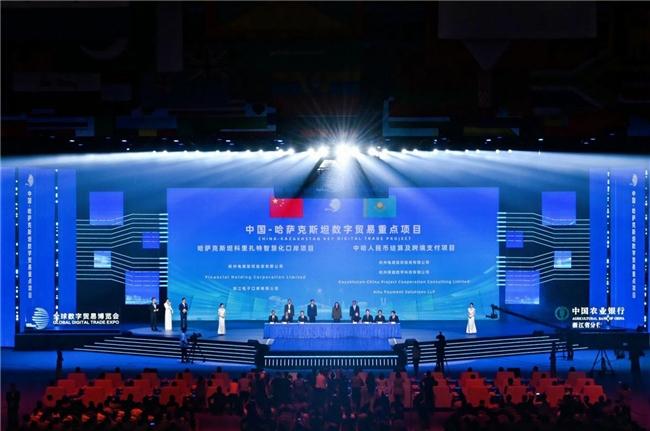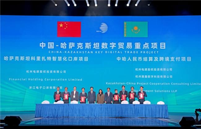 9月25日至29日,第三届数字贸易博览会在浙江杭州隆重举行。9月25日晚,中国-哈萨克斯坦数字贸易重点项目——哈萨克斯坦科里扎特智慧化口岸项目和中哈人民币结算及跨境支付项目的签约仪式在杭州大会展中心成功举行。杭州电建股权投资有限公司董事长吴瑞录先生、浙江电子口岸有限公司董事长孙华伟先生、Financial Holding Corporation Limited董事长Kozhametov Sabit先生共同签署了科里扎特智慧化口岸项目。杭州电建股权投资有限公司总裁徐蕾女士、杭州展鑫数字科技有限公司代表黄自力先生及多位哈萨克斯坦方代表现场签署了中哈人民币结算及跨境支付项目。哈萨克斯坦共和国数字发展、创新与航空航天工业部部长加斯兰·马迪耶夫和杭州市市长姚高员共同见证了签约仪式。此次签约旨在推进中哈两国在数字、经贸等领域的深度合作。