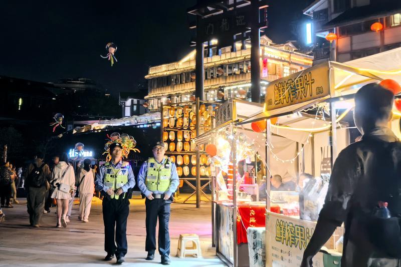 人间烟火气,最抚凡人心。国庆假期,磁器口古镇码头、白居寺大桥湿地公园、海疆博物馆建设码头等处,景区夜市人头攒动、灯火辉煌,更为节日增添一抹“烟火气”,而穿梭其间的闪烁警灯,无疑是这江边夜市最好的“安全阀”。
