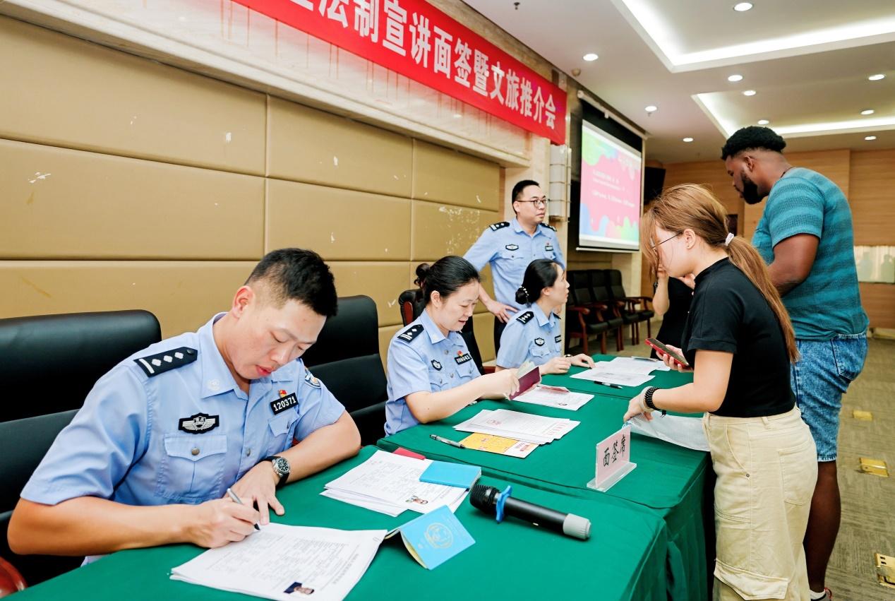 为有效应对西部科学城重庆高新区新留学生报到入学高峰,切实提高留学生的法律法规知识和自我安全防护意识,近日,高新公安出入境部门迅速行动,联合市公安局出入境管理总队境外支队赴辖区重庆大学、重庆师范大学、重庆城市管理职业学院等高校开展“来渝第一课”法律法规宣讲暨签证面签活动。
