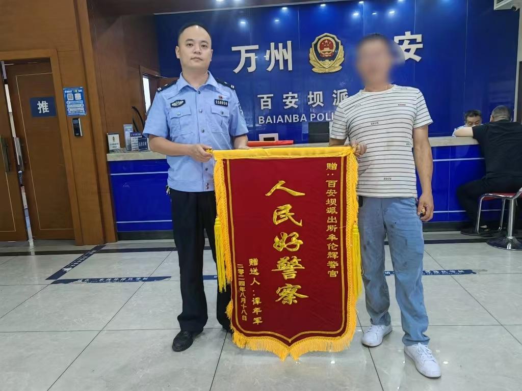 近日,市民谭先生来到万州区公安局百安坝派出所,将一面印有“人民好警察”的锦旗送到民警手中,感谢他们长途跋涉为其追回被骗资金30万元。