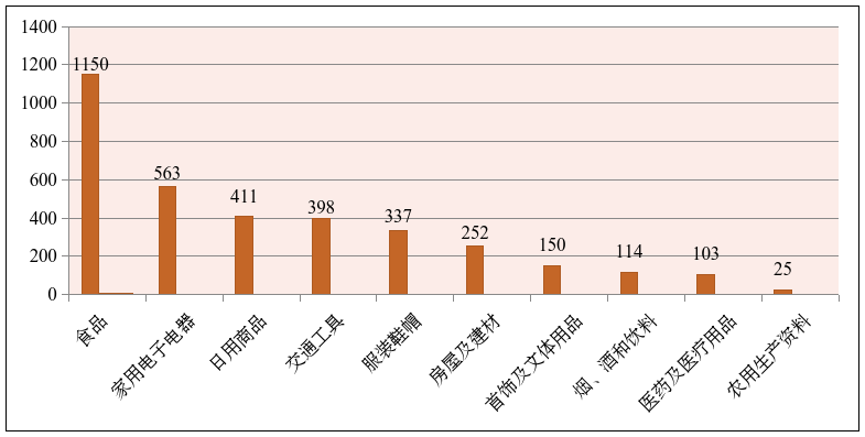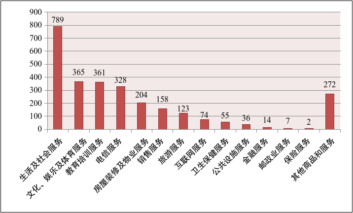在商品类投诉中,食品类投诉、家用电子电器类投诉、日用商品类投诉排名前三;在服务类中,排名前三的则为投诉生活、社会服务类,文化、娱乐、体育服务类,教育培训服务类。