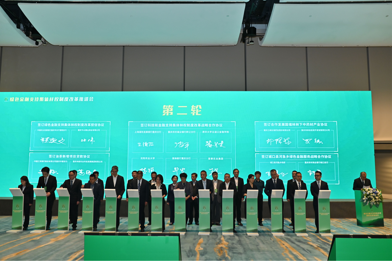 随后,还进行了五组合作协议的签订。其中,清华大学五道口金融学院、沈阳农业大学、重庆农村商业银行、渤海银行、上海浦发银行和重庆蛮寨实业集团签订科技和金融支持集体林权制度改革战略合作协议;重庆林业投资公司和重庆三峡云海药业签订合作发展国储林林下中药材产业协议;农业发展银行酉阳县支行和重庆今山银山公司签订绿色金融支持集体林权制度改革授信协议;重庆农村商业银行城口支行与城口县河鱼乡政府签订城口县河鱼乡绿色金融服务战略合作协议;中国工商银行股份有限公司重庆丰都支行与重庆丰都农业科技发展集团有限公司签订油茶新增项目贷款协议。