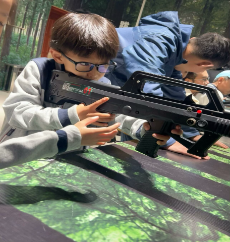 在三楼展区,小鸾娃们有的被重兵器场展示着的“十八般兵器”吸引;有的被逼真的军事场景所吸引,在军事互动体验区内通过虚拟空间感受到我国军事的真实力量;有的在射击体验项目,孩子们端起模拟枪械,瞄准目标,感受着射击的紧张与刺激,他们全神贯注,仿佛自己就是真正的战士,肩负着保卫国家的重任。
