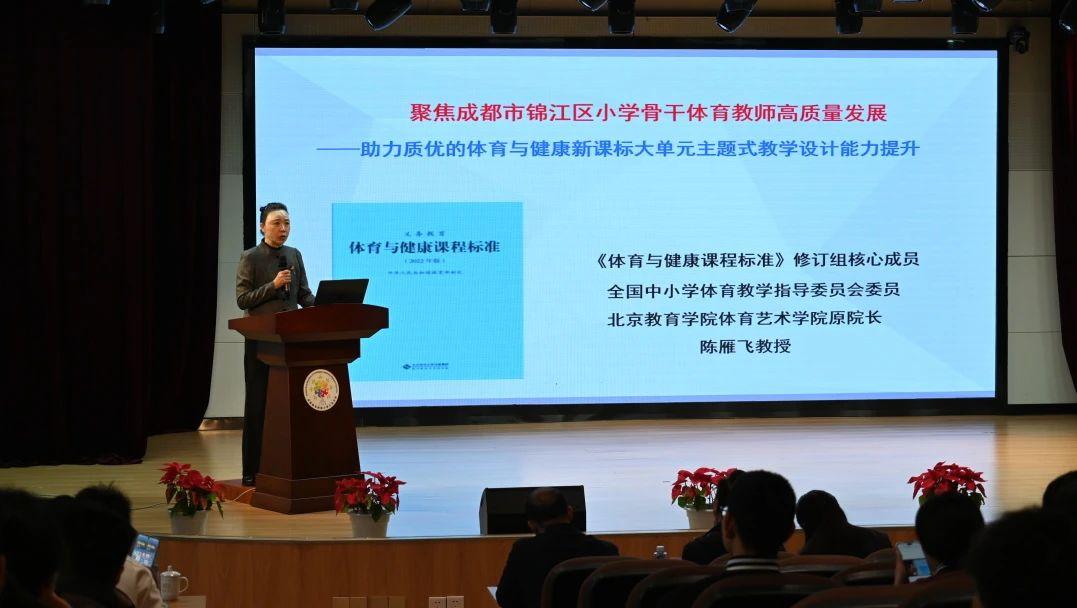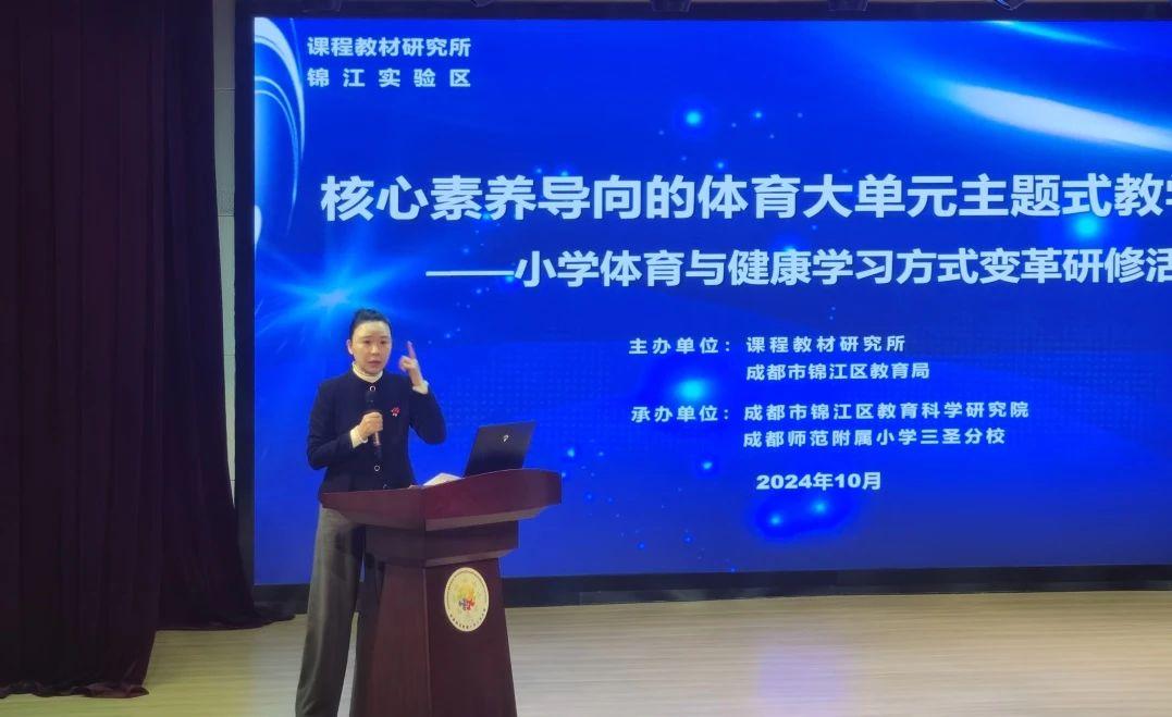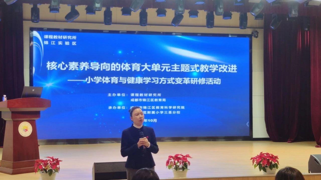 为积极落实“双新”背景下的教育变革趋势,践行更高效能的学科教学理念,推动锦江教育高质量均衡发展,日前,由教育部课程教材研究所与成都市锦江区教育局主办、成都师范附属小学三圣分校承办的“核心素养导向的体育大单元主题式教学改进”主题活动顺利开展。《体育与健康课程标准》修订组核心成员、全国体育教学指导委员会委员、北京教育学院体育艺术学院原院长陈雁飞教授莅临锦江区指导,锦江区中小学全体体育教师参加了学习活动。