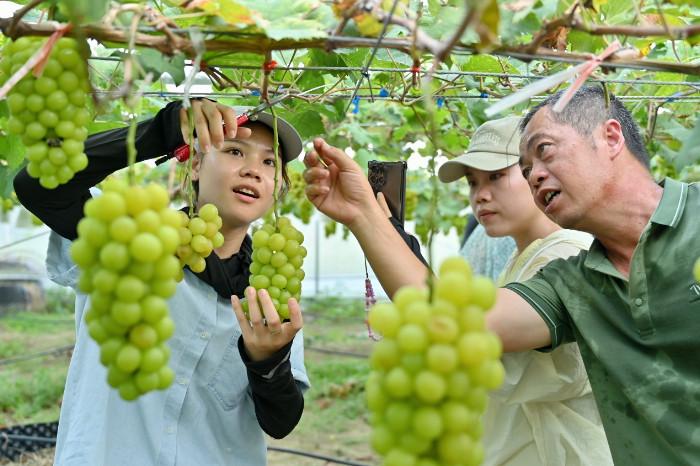 老挝东坎商农业技术学院留学生体验阳光玫瑰葡萄的采摘
