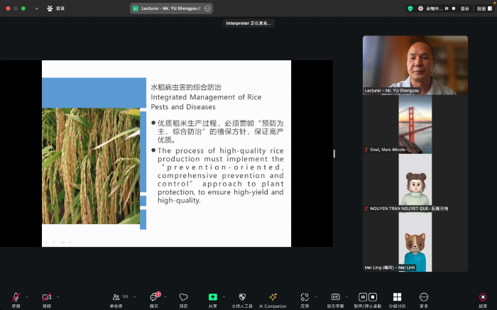 2024年10月25日下午,我校农林牧渔科的余胜尤老师在线上为越南城东大学、菲律宾中央比科尔国立农业大学、菲律宾卡迪威国立大学的师生们带来了一场精彩纷呈的水稻病虫害防治技术讲座。讲座中,余老师深入浅出地讲解了水稻病虫害的种类、危害、防治方法及最新技术进展,并通过实例分析,使与会师生对水稻病虫害防治有了更加全面和深入的了解。