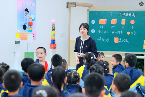 当日下午,一行人走进成都市盐道街小学528校区,欣赏学校老师呈现的精彩课堂。数学教师孙紫菱在课例《怎样搭得高》中,将数学原理与实际操作相结合,指向发展学生结合图形的特征创造性地解决问题的能力。以游戏化的“问题解决”为主线,通过“怎样搭得高——怎样搭得更高——还可以搭得更高”结构化、进阶式的学生活动,引导学生尝试不同组合和搭建方法,合作探究完成结构既稳固又尽可能高的积木塔,激发学生的探索欲和创造力。
