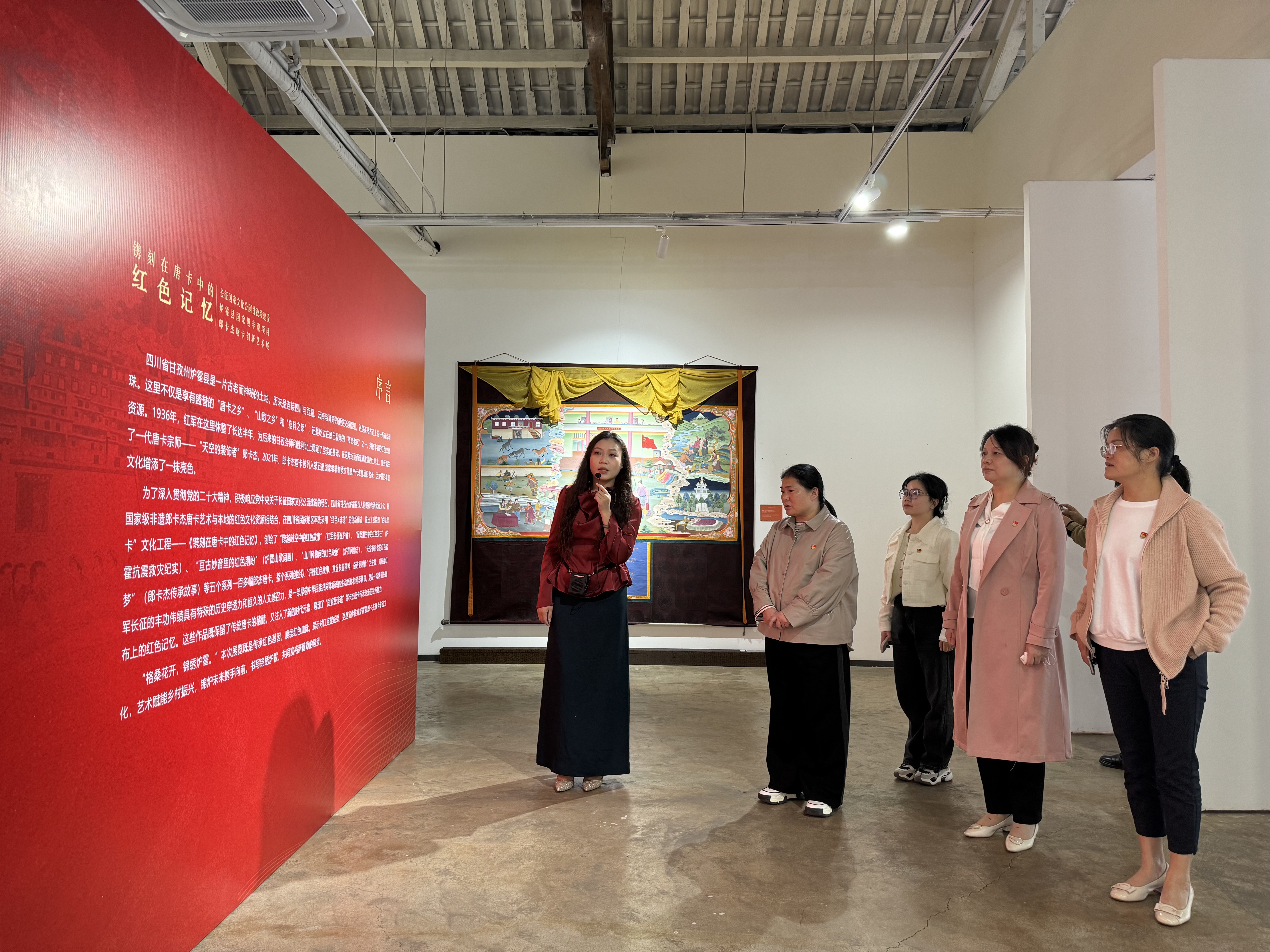 “本次艺术展以郎卡杰唐卡为华丽载体,巧妙地展现了炉霍‘红色记忆’的深邃内涵,将红色文化与非遗文化完美融合,采用‘红色+非遗’的创新模式,共创绘了五个系列。”活动现场,在讲解员的带领下,老师们依次参观了“跨越时空中的红色故事”(红军长征在炉霍)、“涅槃重生中的红色支柱”(炉霍抗震救灾)、“亘古妙音里的红色期盼”(炉霍山歌词画)、“山川风物间的红色映象”(炉霍风物志)、“天空装扮者的红色追梦”(郎卡杰传承故事)等五个系列一百多幅郎卡杰唐卡,深入感受了以国家级非遗郎卡杰唐卡艺术形式生动呈现红色文化的独特魅力和厚重底蕴。