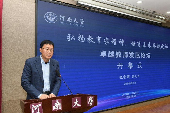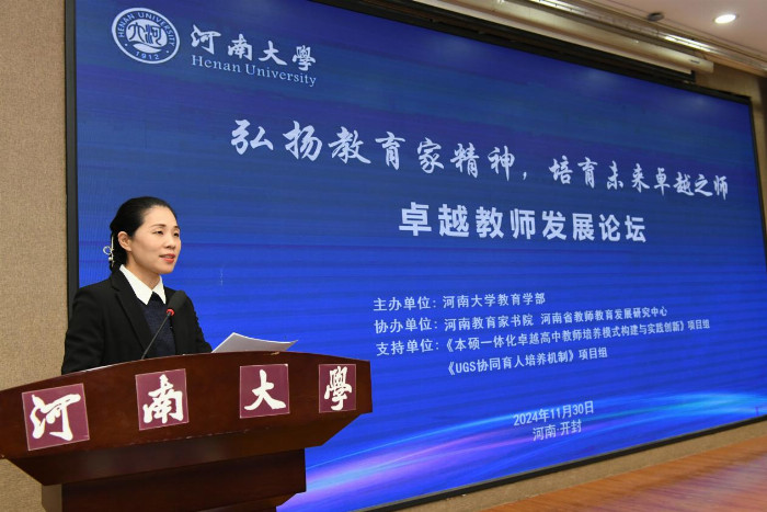 为进一步弘扬教育家精神、落实《教育部关于实施卓越教师培养计划的意见》,总结河南大学卓越教师培养计划改革项目实施十年的经验,提升师范生培养质量,11月30号,由河南大学教育学部主办,河南教育家书院、河南省教师教育发展研究中心协办的“弘扬教育家精神,培育未来卓越之师——卓越教师发展论坛”在河南大学金明校区教育学部一楼报告厅举行。省教育厅教师工作处副处长张会敏、我校副校长张礼刚出席仪式并致辞。省外相关单位专家代表、省内各高等院校卓越教师培养项目负责人、河南大学校内外卓越教师培养单位代表、河南大学卓越教师培养计划项目班毕业生代表以及河南大学教育学部相关领导及教师等数百人参加活动。开幕式由河南大学教育学部副部长、教育学院院长王萍主持。