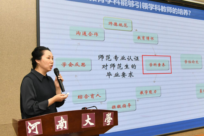 河南大学卓越班牵头导师李桂荣教授作《六维筑基“一体四式”:综合性大学卓越教师培养体系创新》报告。她深入阐释了河南大学“六维筑基‘一体四式’”卓越教师培养体系的内涵,指出通过“项目引领、理论构建,理顺渠道、凝练模式,定规立矩、闭环管理,深度重整、协同共建”等方法不断优化该体系,实现了理念创新、模式创新、制度创新、实践创新,在缔结硕果、示范引领、深度辐射、广泛影响等方面取得显著成效。