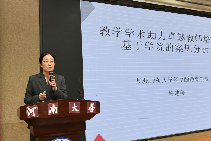 杭州师范大学经亨颐教育学院副院长许建美教授作《教学学术助力卓越教师培养:基于学院的个案分析》报告。她从“举行教学学术工作坊、资助教学学术项目、组建院级教学学术共同体”三个方面梳理了教学学术助力卓越教师培养的学院经验,指出院级教学学术实践有利于激发教师参与教学和研究的兴趣和热情、提升教学学术能力以及提高学生的学习参与和学习结果。