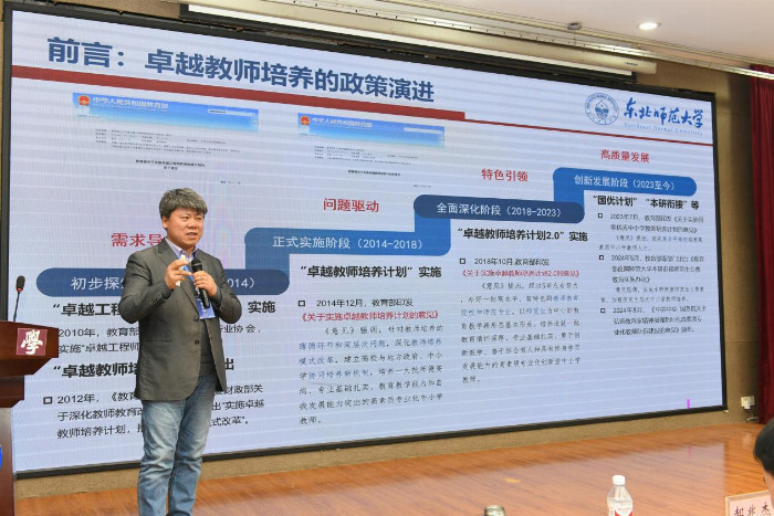 主论坛环节围绕“新时期卓越教师培养模式构建与实践创新”主题开展。东北师范大学教师教育研究院执行院长李广教授作《卓越教师核心特质:个案深描、内容维度与生成理路》的主旨报告。他以东北师范大学卓越教师培养工作为例,指出卓越教师的核心特质包括强化专业发展追求中的自我意识、塑造专业发展常态中的教师尊严等,应从坚持动态发展性的本质规律,走过程专业性的关键路径、激发自主创新性的内在动力以及建立大格局长周期的持续机制等方面提高卓越教师培养成效。