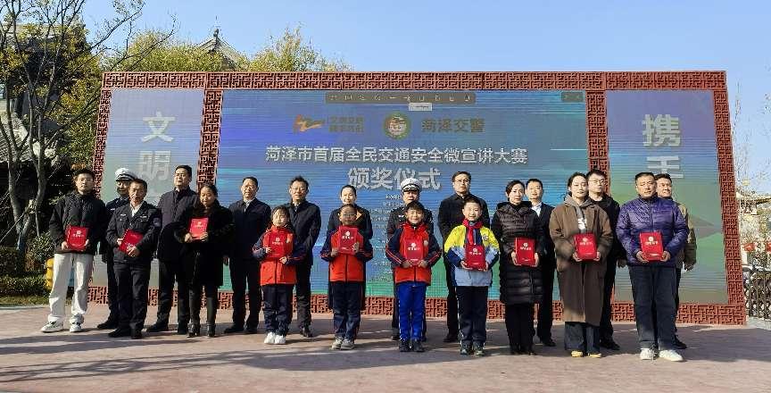 活动现场,与会领导为菏泽市首届全民交通安全微宣讲大赛获奖选手颁奖。随后,还展播了部分获奖优秀作品。