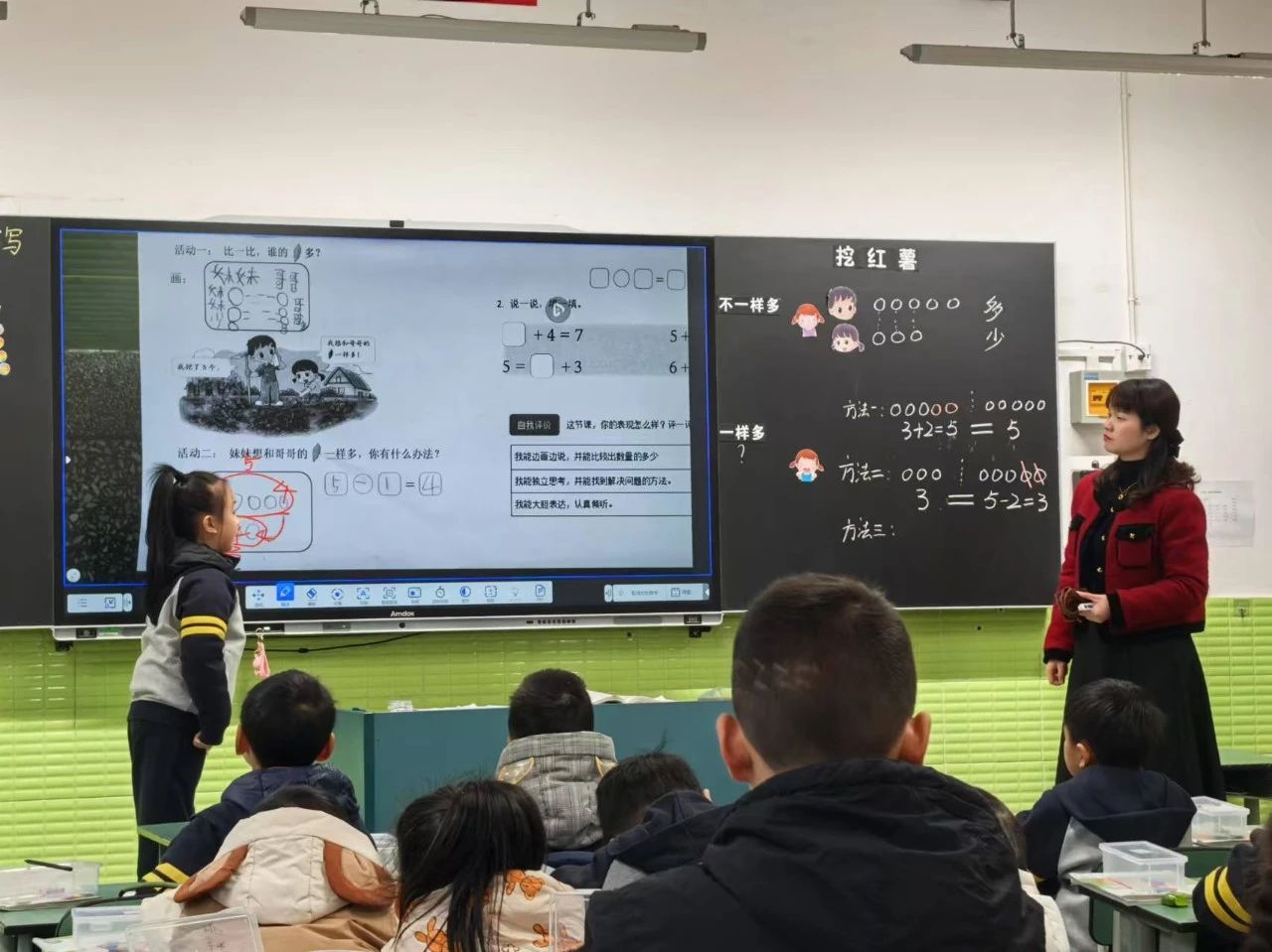 1.1班的孩子们在王小燕老师创设的“挖红薯”的情境中,运用观察、操作、画图等方法,进一步深入感受“=”的含义,体会相等关系。在孩子的操作交流中,王老师重视学生的参与情绪、交往和思维状态,通过评价提升孩子们的学习兴趣,培养数学核心素养。