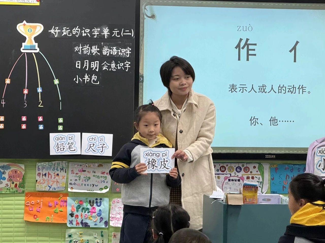一年级刘欢欢老师以“摸一摸文具”为主任务,借助归类识字方法,引导1.2班的花娃娃们在汉字海洋中遨游,种下了花娃娃们生活中识字的种子。
