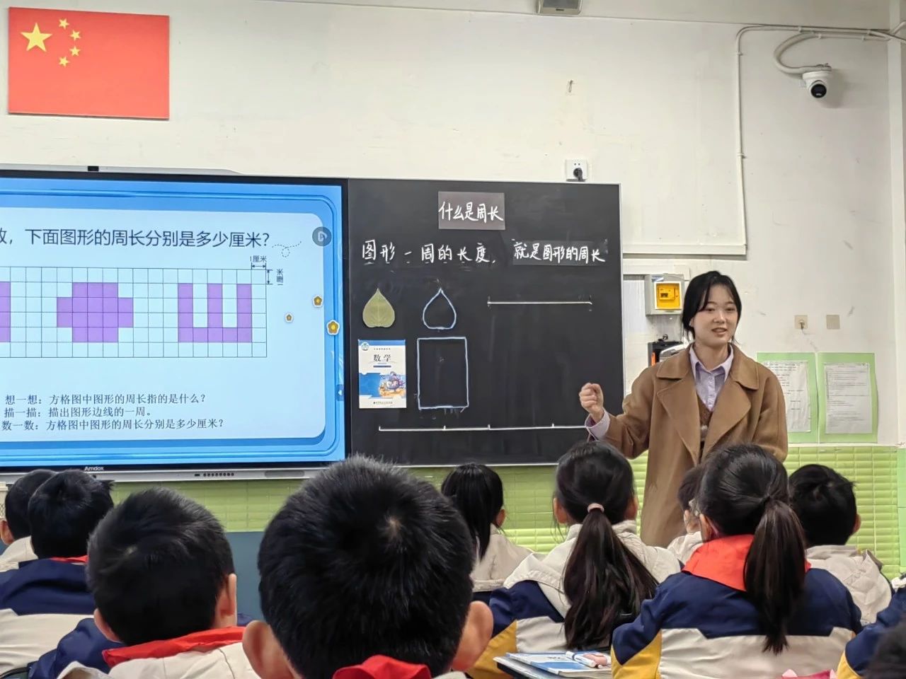在黄钰莹老师执教的《什么是周长》一课中,三年级数学备课组的老师们设计了几个和小蚂蚁相关的情境,使周长的学习始终处在一个整体且有趣的情境中,沟通现实与数学世界,让学习自然地发生及发展,同时通过增加素材、设置剥离周长动作等增加活动的深度及广度,使得学生思维在从一维到二维再到一维的转换中发展量感。