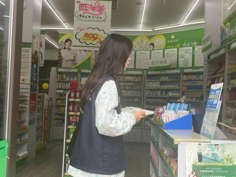(校霆光明峰五洞桥项目人员穿着社区网格员工作服装走访商户拍摄图)