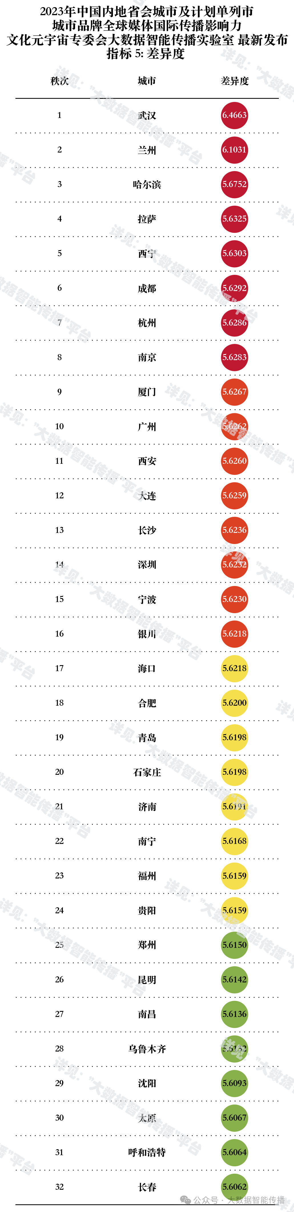 本视角量化实证比较评价的驱动力和差异度的上述两大核心概念和指标,主要考察和判别的是相关省会城市及计划单列市的城市品牌全球媒体传播影响力聚焦于强省会的“强”和“特”的比较。但驱动力的“强”比差异度的“特”更为关键,更为重要。