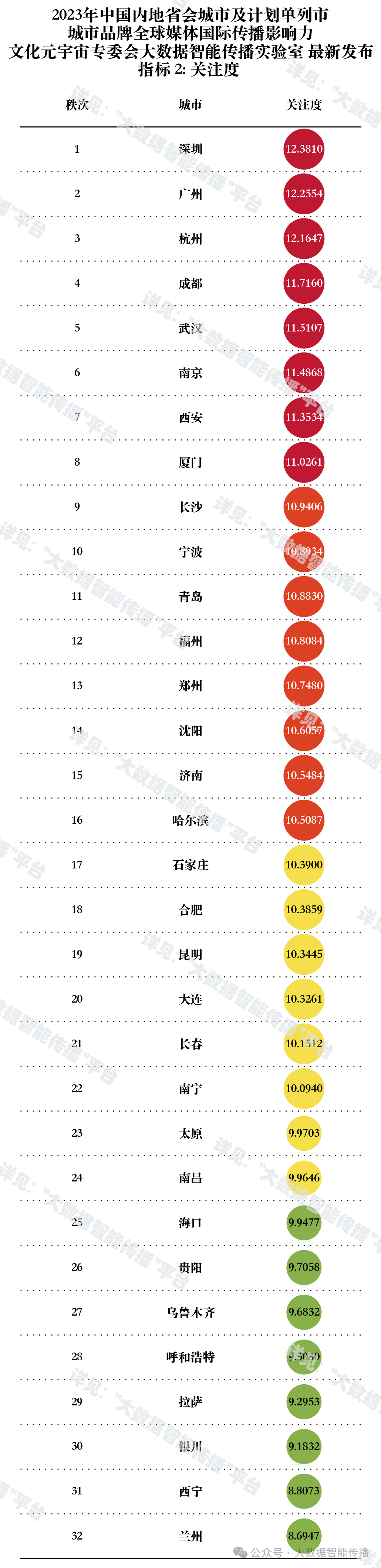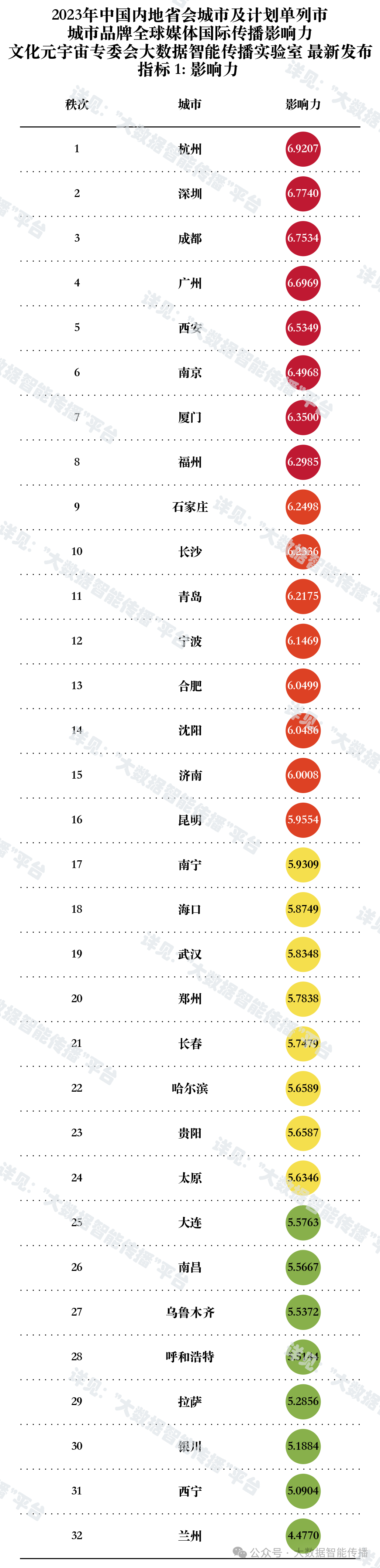 近日,文化元宇宙专委会大数据智能传播实验室发布了《中国内地省会城市及计划单列市城市品牌全球媒体国际传播影响力报告》。报告指出,党的二十大以来,中国进入了全面建设社会主义现代化强国的新时代,中国城市化也随之开启了高质量发展的新征程。在城市化高质量发展进程中,省会城市及计划单列市的地位日益凸显。