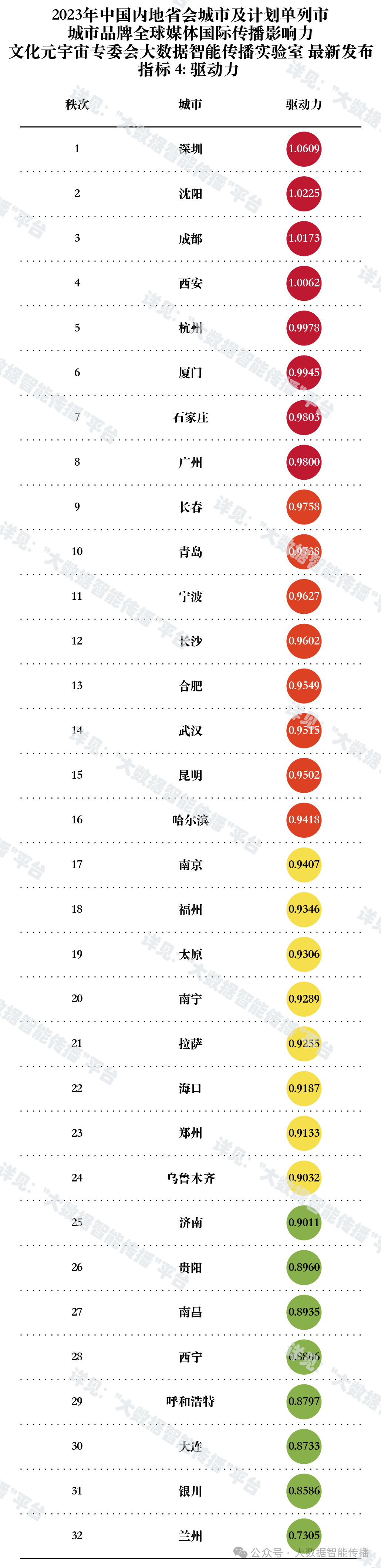 4)驱动力:即指一个城市对一个省的驱动程度,大于1的即说明这个城市超越了本区域这个省的品牌国际传播影响力,小于1则反之。32个城市按驱动比较的强弱程度进行排序。