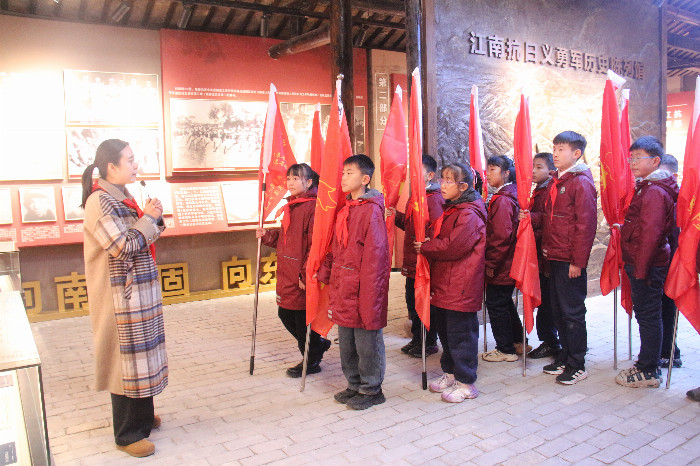活动伊始,全体人员在江抗馆门口集合,开启了研学寻访。在讲解员圣娟的引导下,大家参观了江抗义勇军总指挥部旧址、江抗历史陈列馆、江抗义勇军烈士纪念馆,深入了解其历史文化底蕴。期间,馆内还特别播放了南京大屠杀历史纪录片,那一幕幕沉重的画面,英雄中队队员深刻体会到作为新时代的少年必须铭记历史,奋发砥砺前行。
