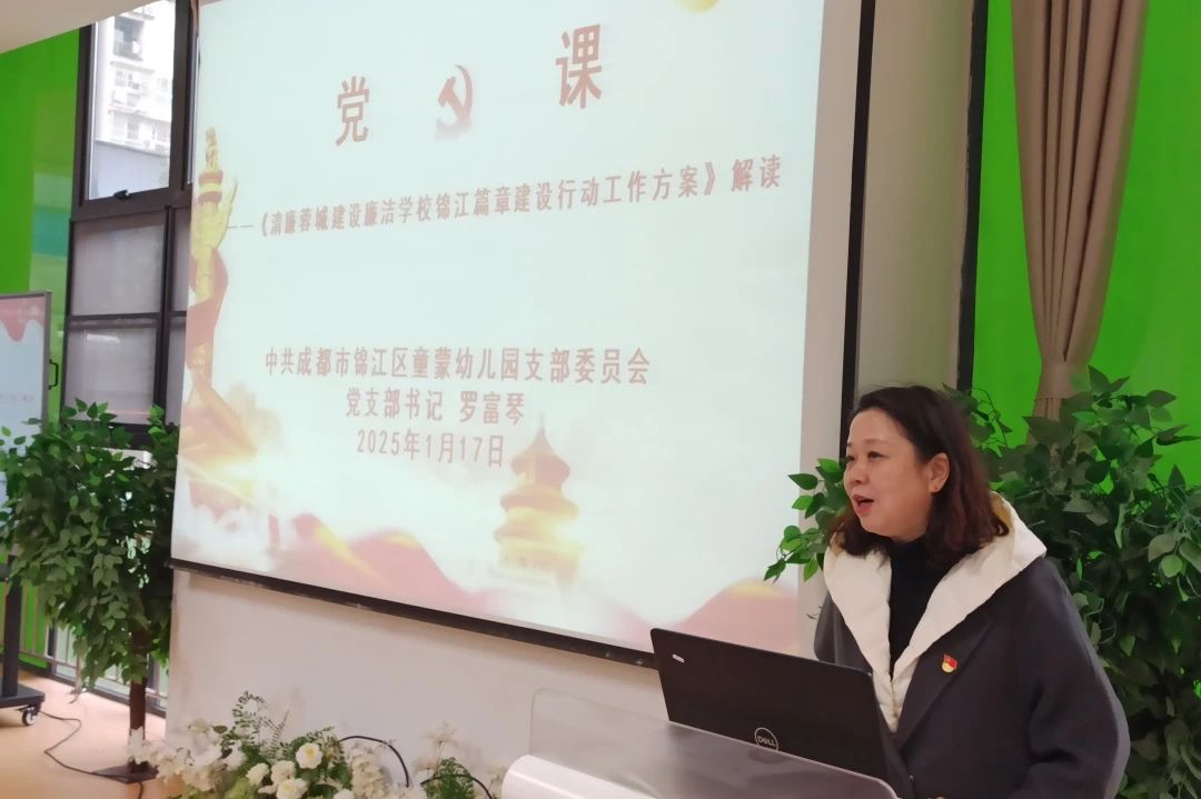随后,党支部书记讲党课——《清廉建设廉洁学校锦江篇章建设行动工作方案》解读,老师们认真聆听,并表示将积极营造校风清净、教风清正、学风清新的校园氛围。同时在师德师风专题培训中,全体教职工重温了中华人民共和国学前教育法。