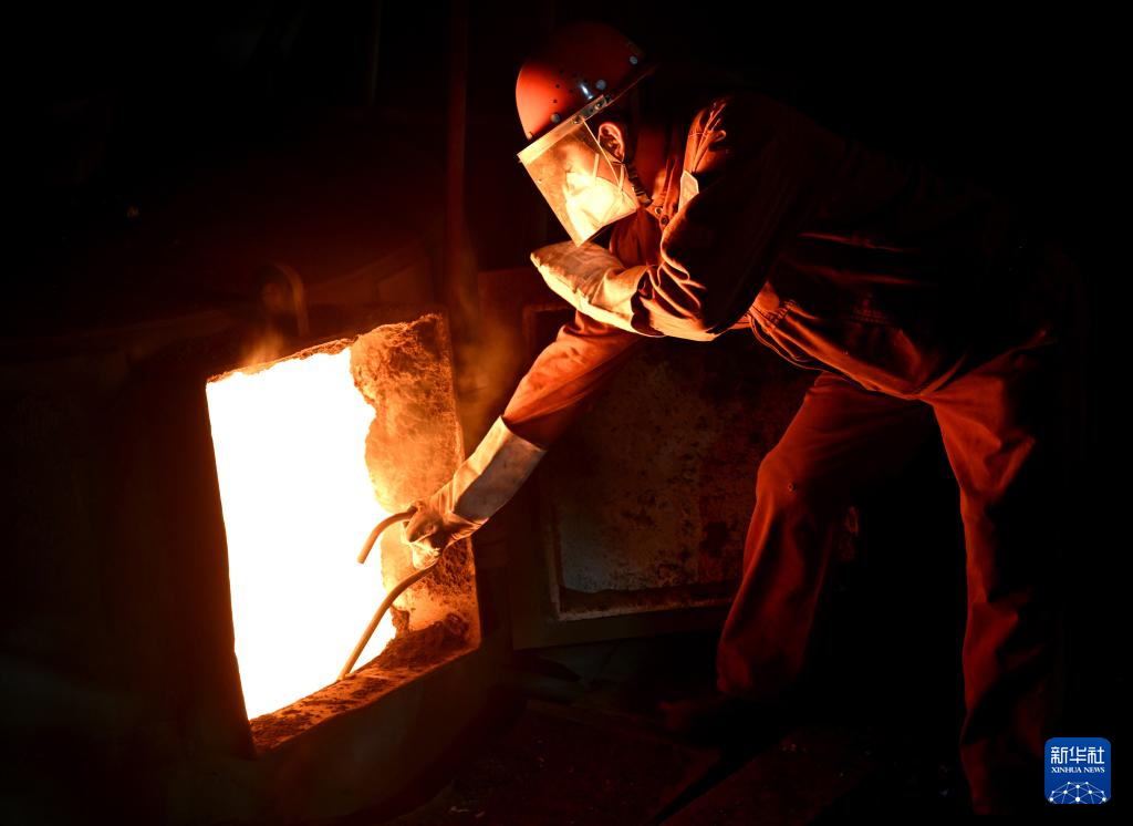 冬夜里,位于河南洛阳的中信重工机械股份有限公司冶炼车间内机器轰鸣,钢花飞溅。1600多摄氏度的钢水将炉前温度带到了近50摄氏度。电炉班的工人顶着高温,头戴防护盔,身着阻燃服,手持测温探棒在炉前忙碌,与钢花共舞。