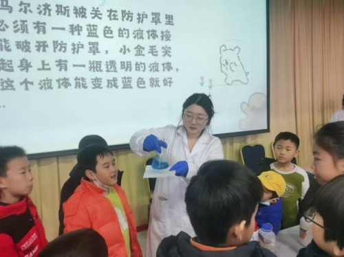 “茶与墨”和“蓝瓶子”实验均为氧化还原反应,前者用生活中常见的饮品——茶,向我们展示了茶中的鞣酸和三价铁离子反应变黑,又被草酸还原变回茶水的过程。后者的实验药品则取材于我们赖以生存的氧气和身体的能量供应者葡萄糖,并选择甲基蓝作指示剂。蓝-透明-蓝的颜色变化过程,让小朋友们了解了空气中氧气的氧化能力。