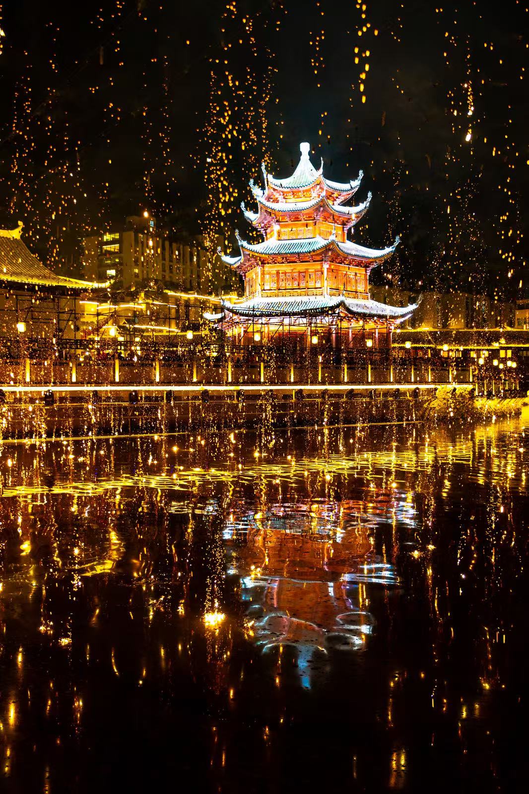 南官河上,非遗落花秀惊艳开场,点点火花如星河璀璨,随风而舞,在夜空中倾落;新春大戏《禧乐长街 福地路桥》连接路桥在地文化,为游客们演绎宋时十里长街廿五间的故事。