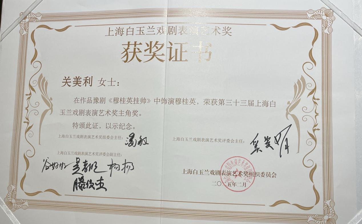豫韵飘香,牡丹绽放。2025年2月27日晚,第33届上海白玉兰戏剧表演艺术奖颁奖典礼在上海文化广场隆重举行。洛阳市文联副主席、洛阳市戏剧家协会副主席、洛阳豫剧院院长、豫剧马派传人关美利凭借豫剧《穆桂英挂帅》的精彩演绎,斩获主角奖,为豫剧马派艺术再添殊荣。