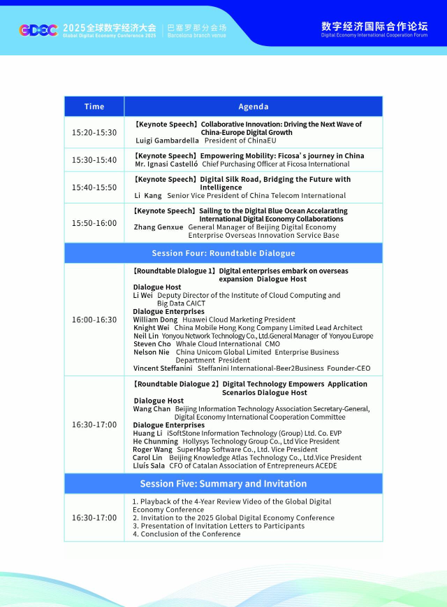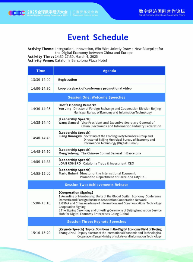 The 2025 Global Digital Economy Conference will host its International Cooperation Forum series in Barcelona, Spain on March 4, marking the conference's first European venue. Themed "Integration, Innovation, Win-Win: Co-creating a New Blueprint for the China-Europe Digital Economy," the forum will focus on digital friendship and digital development, promoting the flourishing development of the China-Europe digital economy, and will showcase the broad prospects of China-Europe cooperation through four key highlights, injecting new vitality into the global digital economy.