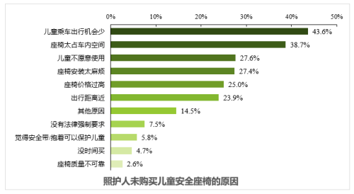 此次调研显示,在儿童安全座椅的配备方面,59.4%的调研家庭已配备儿童安全座椅。而未配备的家庭中,儿童乘车出行机会少、座椅占空间、儿童不愿意使用是导致照护人未购买儿童安全座椅的三大主要原因,其中没有法律的强制要求占了7.5%。调研同时发现,家庭收入对安全座椅的配备有一定影响,月收入不足5000元的家庭配备率(43.8%)远低于月收入超过20000元的家庭(71.8%)。低收入家庭普遍反映安全座椅“价格偏高”,部分家长建议通过政府补贴或租赁模式降低家庭购椅成本。