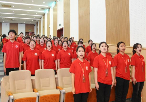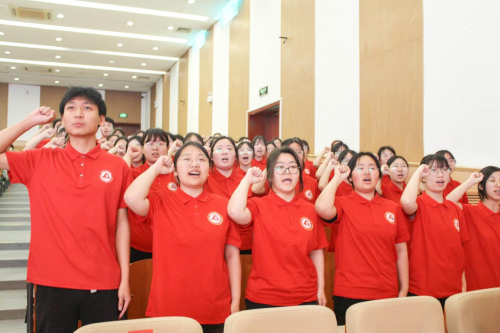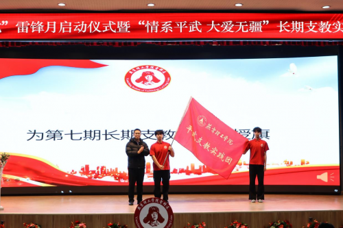 校党委学工部长宣银为第七期长期支教志愿者授旗。号角吹响,以支教为名,用爱出发,为乡村教育事业奉献青春力量。