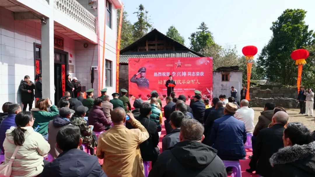 在沙塔坪乡大木塘村,横幅招展、锣鼓喧天,沿途村民纷纷驻足称赞。送喜报的队伍抬着“最美新时代革命军人之家”牌匾,在群众的簇拥下来到李兴坤家中。武警贵州省总队机动支队政治工作处中校主任夏佰旭介绍了李兴坤从军以来取得的先进事迹。随后,杜乃华、刘克敏为其送上“最美新时代革命军人之家”牌匾。
