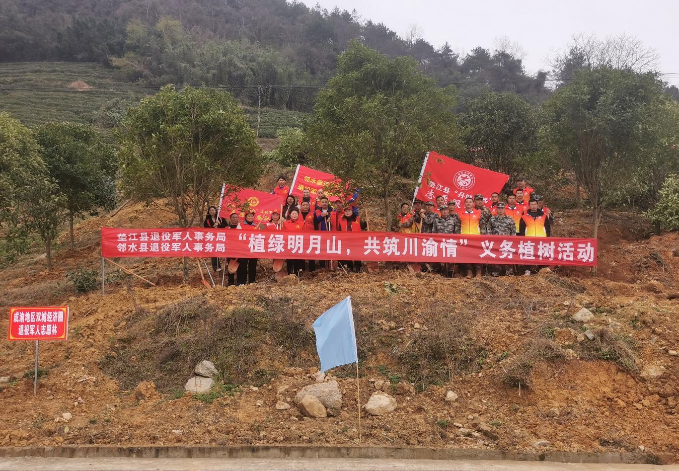 在第47个植树节来临之际,3月10日,四川省广安市邻水县退役军人事务局携手重庆市垫江县退役军人事务局,在明月山一侧的垫江县沙坪镇开展了“植绿明月山,共筑川渝情”义务植树活动,此次活动旨在通过实际行动深入践行“绿水青山就是金山银山”理念,共建成渝地区双城经济圈退役军人志愿林。