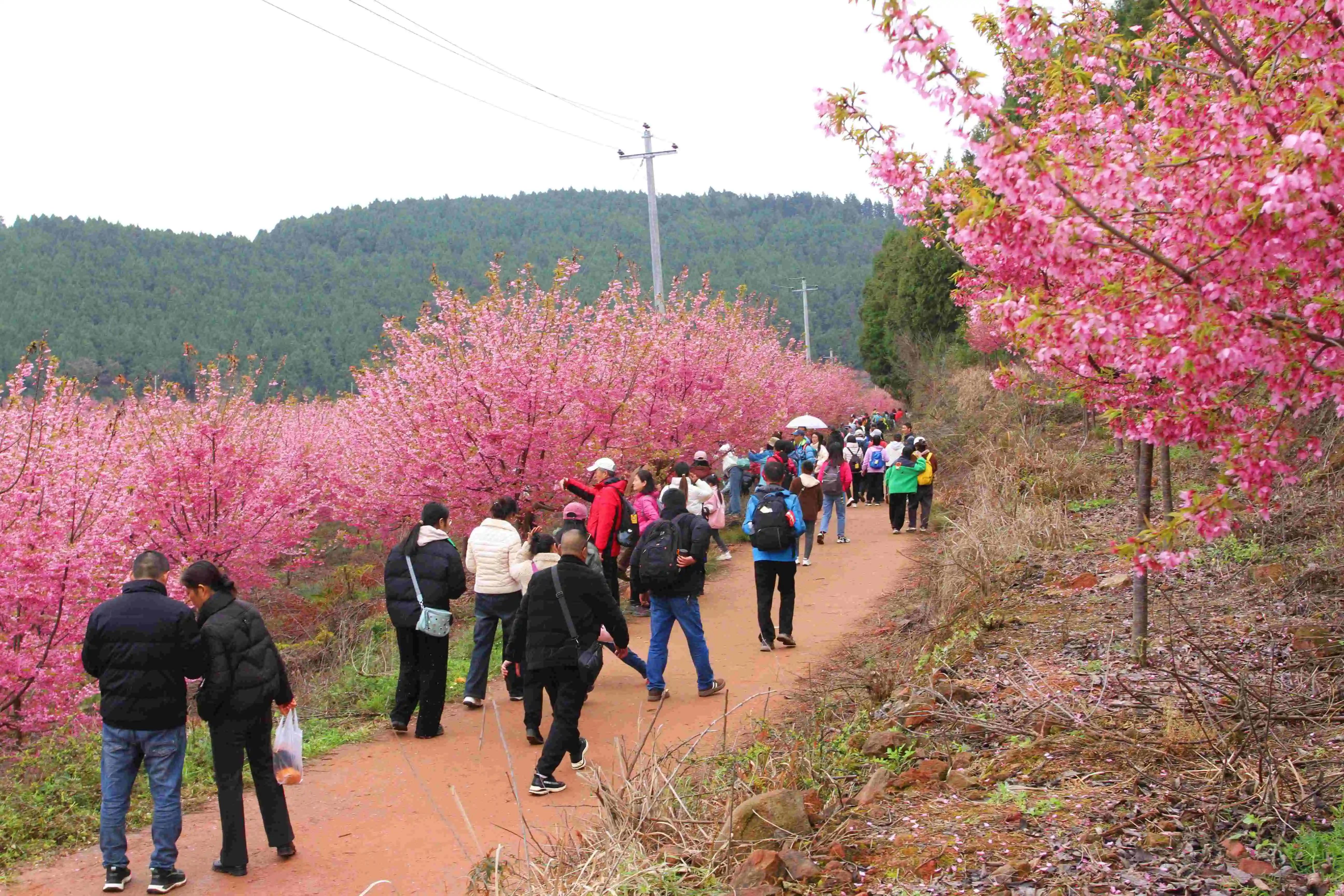 在经过桂花村的油菜花田后,徒步者们来到了荷韵龙居。正值春日,龙居村的樱花迎来了盛放期。徒步途中,一片片樱花林在微风中摇曳生姿,粉白交错的花瓣仿佛为田野铺上了一层梦幻的轻纱。