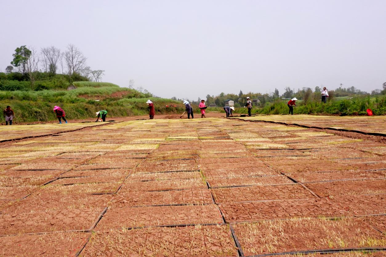 4月14日,在四川省广安市广安区龙台镇车塘村,村民正在田里摆放刚刚发芽的机械化育秧秧盘。