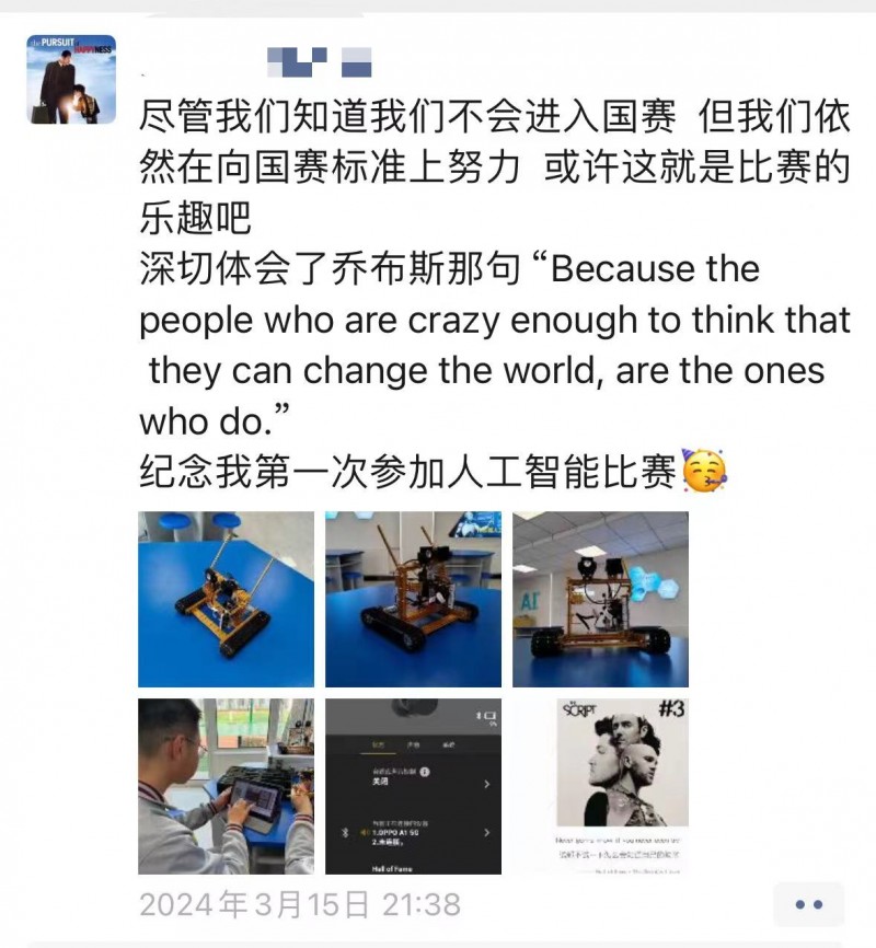 去年央馆学生数字素养提升实践活动前夕,高静瑶老师带领学生研发智能家居节能系统。尽管晋级希望渺茫,但学生们依然在比赛的前一天准备到很晚。“尽管我们知道不会进入国赛,但我们依然在向国赛标准上努力,或许这就是比赛的乐趣吧......’”第二天,学生在朋友圈写下这些话令高老师动容。