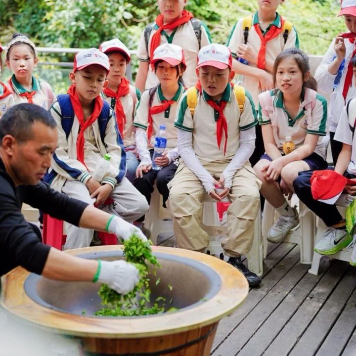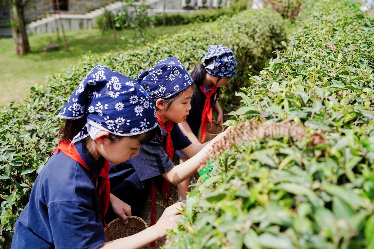 随后,孩子们换上采茶服,变身小茶农,在茶农爷爷的指导下采摘茶尖。他们穿梭在茶园之间,亲手采摘鲜嫩的茶叶,体验劳动的艰辛与快乐。走进车间后,孩子们又目睹了从鲜叶到香茗的复杂制作工序,深刻体会到一杯好茶的来之不易,也感受到劳动的价值。