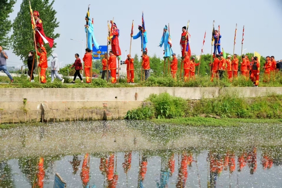 惊险刺激的抛叉、技艺精湛的踩高跷、灵动多姿的挑花篮、气势磅礴的锣鼓队……巡游队伍从祠山庙出发,抬着祠山大帝围绕蒲塘村,沿途穿过蒲塘老街,走上圩埂,再上蒲塘桥,经过渔歌转盘,最后回到蒲塘大戏台。