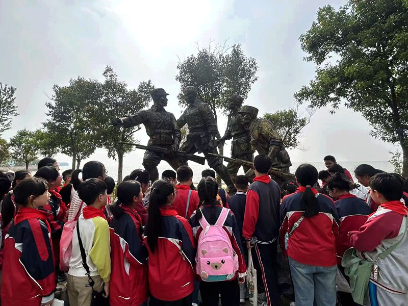 在老师的带领下,孩子们来到“陈毅过湖碑”前。抗日战争和解放战争期间,洪泽湖地区是最重要的敌后根据地,新四军军长陈毅曾三次在此渡湖。碑身静静矗立,无声诉说着那段波澜壮阔的革命岁月。孩子们真切感受到革命先辈的英勇无畏,立志传承红色基因,铭记今日和平的来之不易。