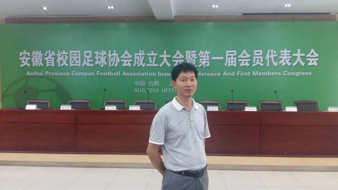 图为2018年8月黄好森参加安徽省校园足球协会成立大会